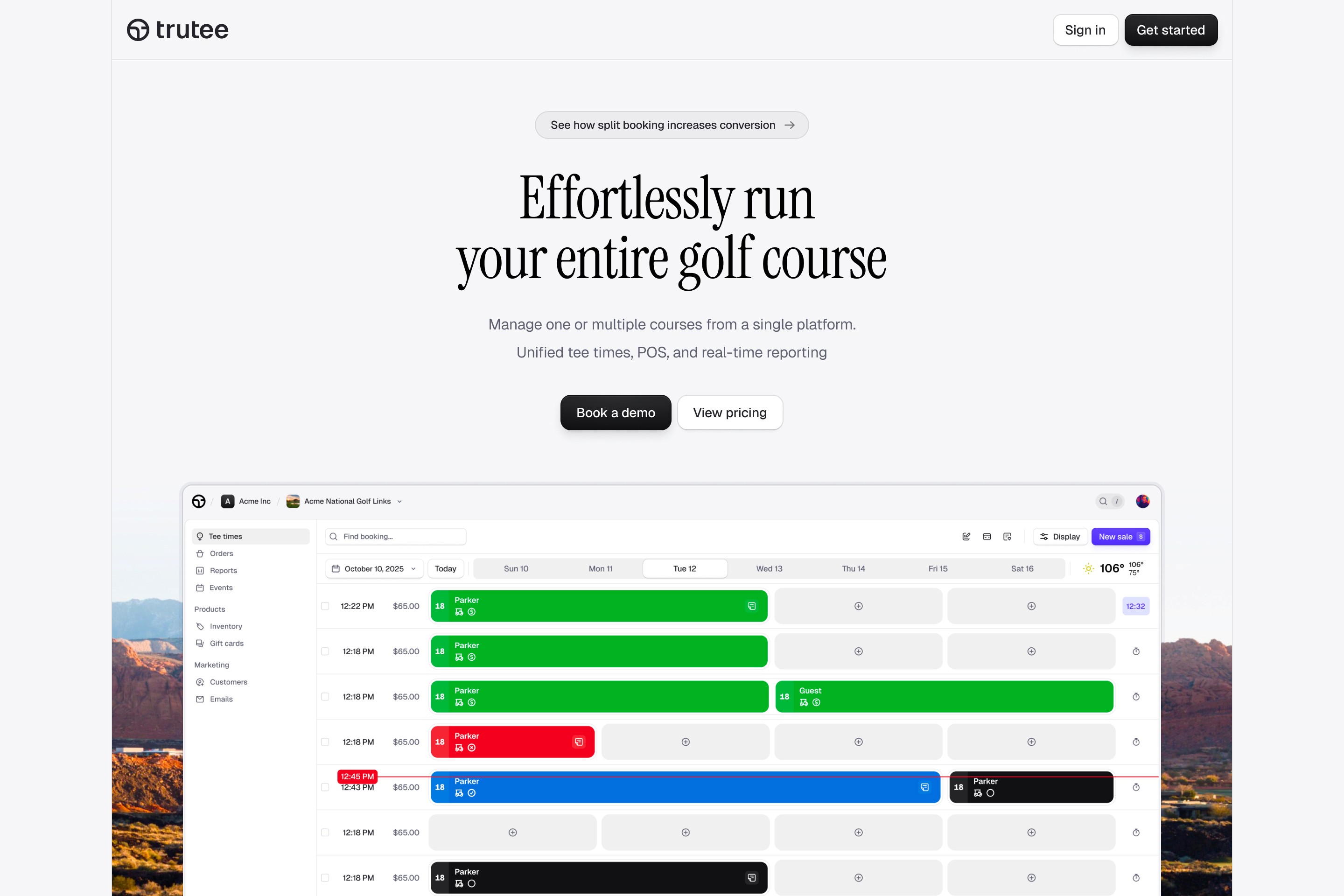Trutee Golf is the platform I'm designing and building as a solo founder. It includes a real-time tee sheet, automated waitlists, multi-course booking, POS and payments via Stripe, and AI-powered reporting. I own everything: product strategy, UX, system architecture, frontend code, pricing model, and go-to-market.